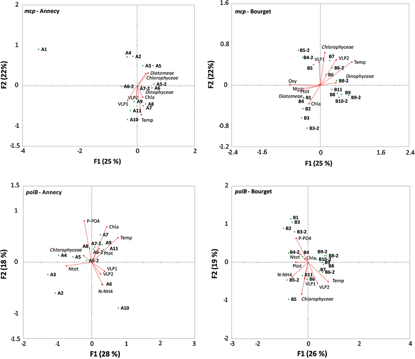Double-stranded DNA viruses infecting eukaryotic algae (e.g., phycodnaviruses) and cyanobacteria (e.g., cyanophages) are now recognized as widespread and ubiquitous in aquatic environments. However, both the diversity and functional roles of these viruses in fresh waters are still poorly understood. We conducted a year-long study in 2011 of the community structure of planktonic virus groups in the upper lit layer of two important freshwater natural ecosystems in France, Lake Annecy (oligotrophic) and Lake Bourget (oligo-mesotrophic). Using PCR-DGGE to target a number of different structural and functional signature genes, i.e.,g20, g23, psbA, polB, and mcp, the phytoplankton viruses were shown to display temporal and spatial variability. There were marked seasonal changes in community structure for all viral groups in Lake Bourget, but only for T4-like myoviruses and psbA-containing cyanophages in Lake Annecy. The multivariate statistical analyses revealed that (1) various environmental factors can directly or indirectly explain the community structure observed for each phytoplankton viral group, and (2) temporal patterns of T4-like myovirus community structure were similar between the two lakes. In general, our results (1) suggest that the observed algal virus patterns were associated with significant shifts in phytoplankton biomass and/or structure, which in turn were shaped by the abiotic environment, and (2) support the Bank model proposed by Breitbart and Rohwer (Trends Microbiol 13:278–284, 2005). This study provides new evidence that freshwater lakes contain a significant diversity of algal viruses, and that the distribution of these viruses strongly mirrors that of their hosts.